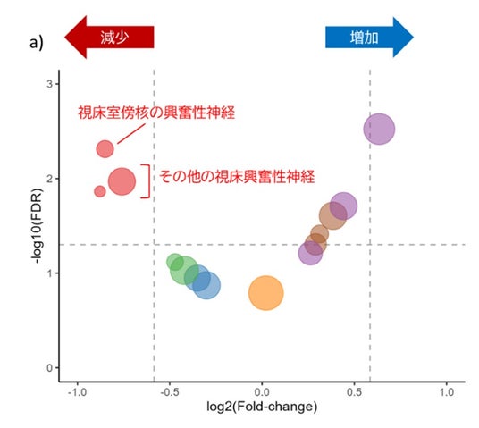 b) 免疫組織化学解析による、視床室傍核神経細胞数の減少