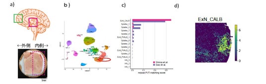 b) 単一核RNA解析で視床室傍核と思われる細胞群を同定