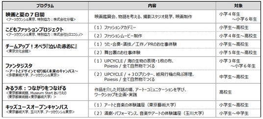 今年度は、昨年度好評を得たコシノヒロコ氏監修のファッションプロジェクトに加え、新たに是枝裕和監督監修による映画や、ビジュアルアートの制作体験など6プログラムを展開。子供たちの芸術文化への夢や個性に寄り添いながら豊かな才能の開花を後押しすることを目指します。
