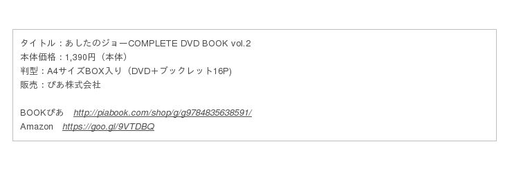 ぴあ株式会社では、「あしたのジョー」連載開始50周年を記念して、TVアニメ版「あしたのジョー」全79話&「あしたのジョー2」全47話を完全収録する『COMPLETE DVD BOOK』シリーズを、3月より月1回ペースで刊行スタート。本日4月19日にvol.2が発売となりなりました。