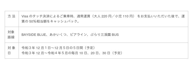 令和3年 10 月1日から 109 系統特急便にて実証実験を行っている「Visa のタッチ決 済」について、令和3年 12 月1日から、横浜の人気観光スポットをめぐる「BAYSIDE BLUE」、 「あかいくつ」、「ピアライン」、「ぶらり三溪園 BUS」の4路線にも拡大します。 また、キャッシュバック対象日に Visa のタッチ決済で4路線をご利用のお客様には、 三井住友カード株式会社の協力による 50%キャッシュバックを行い、キャッシュレス決 済手段の利用拡大や今後の可能性を検証します。