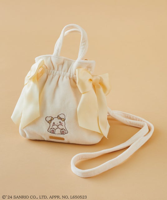 また、帆布素材を使用したトートバッグにはリボンからちょこんと覗く「まるまる」の姿を刺繍し、まるまるをイメージしたアイボリーの毛足の短いファー素材を使用した2Wayミニダブルリボントートをラインアップ。