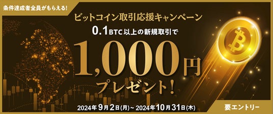 期間中に本キャンペーンにエントリーしていただくと、0.1BTC以上の新規取引をするだけで、条件を達成した方“全員に”1,000円プレゼントいたします。