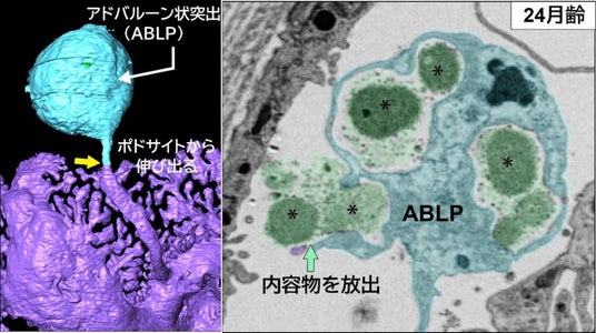 老齢ポドサイトではポドサイトから伸び、先端に細胞内容物を含む膨らみをもつ構造(アドバルーン状突出:ABLP)が観察された。ABLPの先端から細胞内容物を放出する様子もみられた。