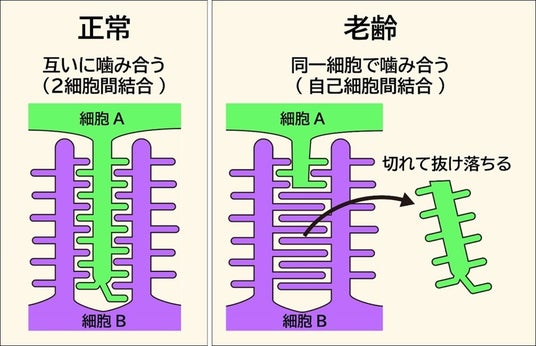 正常なポドサイトでは隣接する細胞同士の足突起が噛み合い、2細胞間結合を形成する。一方で、老齢ポドサイトでは、同一細胞で足突起が噛み合う自己細胞間結合が観察された。消失した突起の領域を臨機応変に覆い直した痕跡だと考えられる。