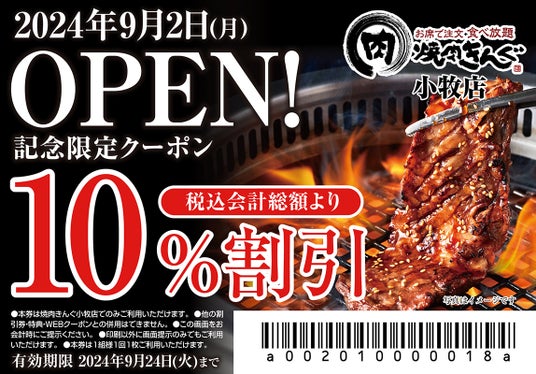 株式会社物語コーポレーション(本社:愛知県豊橋市/代表取締役社長:加藤 央之)は、2024年9月2日(月)に全国328店舗目となる『焼肉きんぐ 小牧店』(愛知県小牧市)をグランドオープンいたします。これを記念して、2024年9月24日(火)までご利用いただける『焼肉きんぐ 小牧店』限定のwebクーポンを配布します。