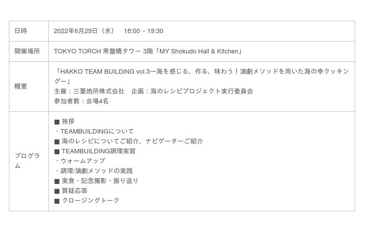 「食」と「ものがたり」を通して海を伝えるウェブメディア「海のレシピプロジェクト」を運営する海のレシピプロジェクト実行委員会は「HAKKO MARUNOUCHI 2022 Spring」に企画参加し、6月29日(水)にTOKYO TORCH 常盤橋タワー3階「MY Shokudo Hall & Kitchen」にて、演出家と料理家のナビゲートによる少人数制のスペシャルなチームビルディング料理教室「HAKKO TEAM BUILDINGー海を感じる、作る、味わう!演劇メソッドを用いた海の幸クッキング」を開催いたしました。