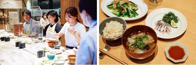 参加者は、自分で書いた魚の名前でお互いを呼び合う形式で実習がスタート。調理開始前は、演出家の大谷さんによりウォームアップ「2UP3DOWN」ゲームを実施しました。一列に並び、目を閉じた状態で2人が立ち、3人が座ることをリズミカルに繰り返すこのゲームは、お互いの動きを視覚以外の感覚で感じながら動くことで日常とは異なる感性が刺激され、参加者同士のチーム感が高まる様子がうかがえました。次に、調理を開始。海の幸鰯を使った「鰯の酢締め」をはじめ、「胡瓜と豚バラ肉、レタスの塩糀炒め」「新生姜炊き込みごはん」「炒め茄子と新玉葱、大葉の味噌汁」の計4品を、料理人の大黒谷さんに指導していただき、役割分担をしながら進めました。