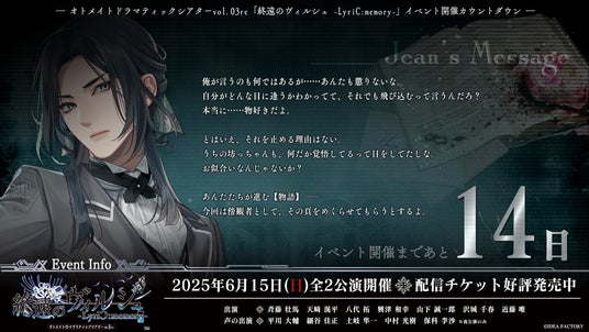 アイディアファクトリー株式会社(代表取締役社長:佐藤 嘉晃/所在地:東京都豊島区)の女性向けゲームブランド「オトメイト」は、朗読イベントシリーズ・オトメイトドラマティックシアターvol.03re「終遠のヴィルシュ -LyriC:memory-」が2週間後の【6月15日(日)】に開催されることをお知らせいたします。
