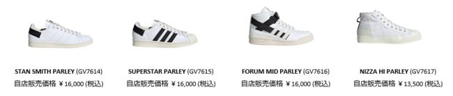 全モデルのシューレース、「STAN SMITH」「FORUM」のキャンバス、ウェビング、テキスタイルにはParley Ocean Plastic素材を100%使用しています。「SUPERSTAR」「STAN SMITH」「FORUM」には、生産工程で不要になったBOOSTを粉砕した素材を20%使用しています。さらに、「NIZZA HI」「ZX 8000 PARLEY」のアウトソールには天然ラバーを80%採用しており、「NIZZA HI PARLEY」はウェビングを巻き付け、1層ずつ組み立てていくことで、生産工程で生じるゴミを最小限に抑えています。