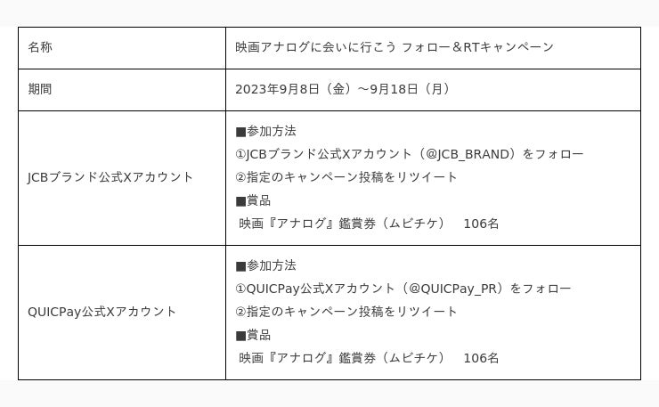 株式会社ジェーシービー (本社:東京都港区、代表取締役兼執行役員社長:二重 孝好、以下:JCB)は、映画『アナログ』とタイアップし、映画鑑賞券が当たるX(旧Twitter)キャンペーンを2023年9月8日(金)より開始します。