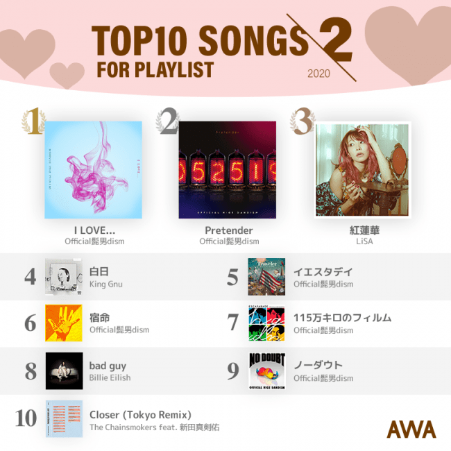 2020年2月の『プレイリスト採用楽曲ランキング』で見事1位に輝いたのは、TOP10に6曲がランクインしたOfficial髭男dismから、2月にリリースしたばかりの佐藤健、上白石萌音出演のドラマ『恋はつづくよどこまでも』主題歌「I LOVE...」でした。先月のランキングで1位に輝いた「Pretender」が2位に輝き、「イエスタデイ」「宿命」「115万キロのフィルム」「ノーダウト」全6曲がランクインしており、Official髭男dismの圧倒的な人気が伺えます。そのほか、先月14位だった『第62回グラミー賞』で主要4部門を含め、見事5冠に輝いたBillie Eilishの「bad guy」が、ジワジワと順位を上げ8位にランクイン。10位には、俳優の新田真剣佑がThe Chainsmokersの名曲「Closer」をカバーし話題となった、「Closer (Tokyo Remix)」がランクインしています。ぜひこの続きは、ランキング50位まで発表しているAWA公式アカウントのプレイリストでお楽しみください。