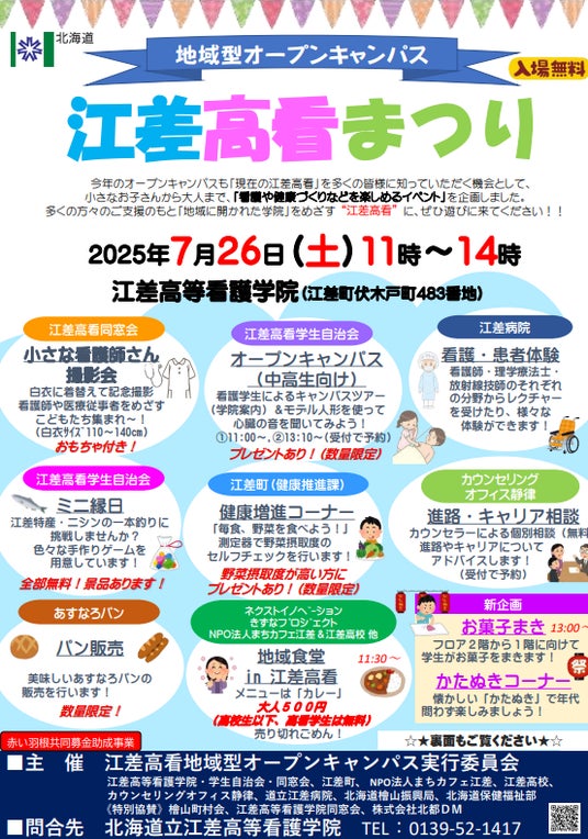 北海道立江差高等看護学院では、「現在の江差高看」を多くの皆様に知っていただく機会として、「江差高看まつり」(地域型オープンキャンパス)を開催します。