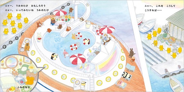 「ニャー、うみのたび おもしろそう」。ノラネコたちがいつもより前のめり(?)でのぞいているのは、出港直前のクルーズ船。大ヒット絵本シリーズの誕生10周年・10作目にあたる本作は、海が舞台のスペクタクル・ファンタジー! にぎやかな船の旅&毎度おなじみのあのシーンをお楽しみください♪