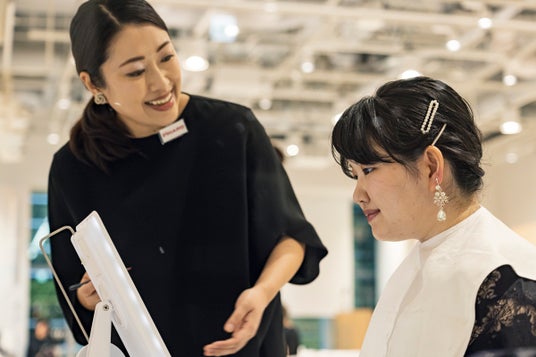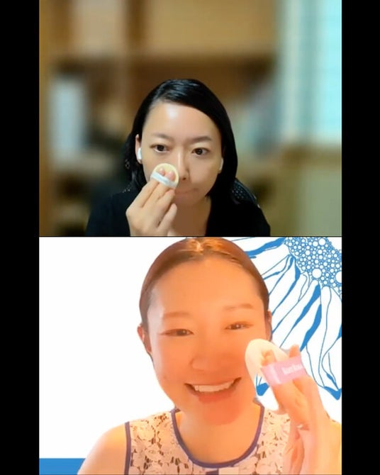 事前のメイクサポートプログラムで、ファイナリストの堀(上)にベースメイクの基本を教える花田。メイクセミナーは終始和気あいあいとした雰囲気で進められた。