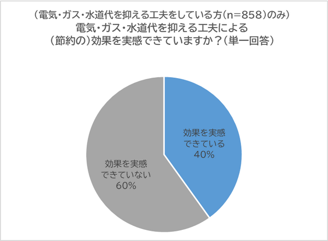 一方、「工夫をしている」と回答した方に、工夫による節約の効果を実感できているかについて尋ねたところ、「効果を実感できている」と回答した人は約4割にとどまり、約6割の方は効果を実感できていないという結果になりました。