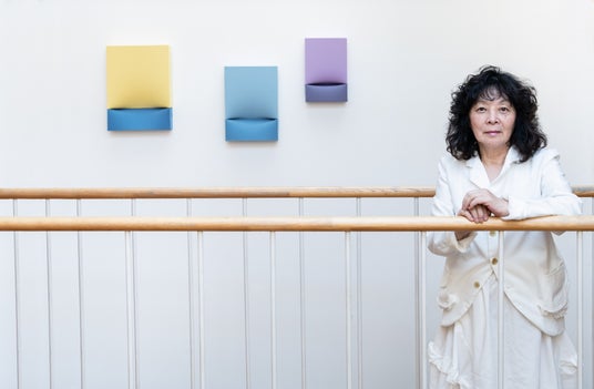 渡辺信子は1948年東京生まれ。相愛女子大学音楽学部器楽学科ピアノ科を卒業し、音楽家として出発するも、「具体美術協会」メンバーとの出会いを機に美術作品の制作を開始しました。以降、幼少期から親しんだピアノと絵画をベースに、美術と音楽を横断し、色・形・空間をテーマに存在の関係性を考える作品を制作しています。