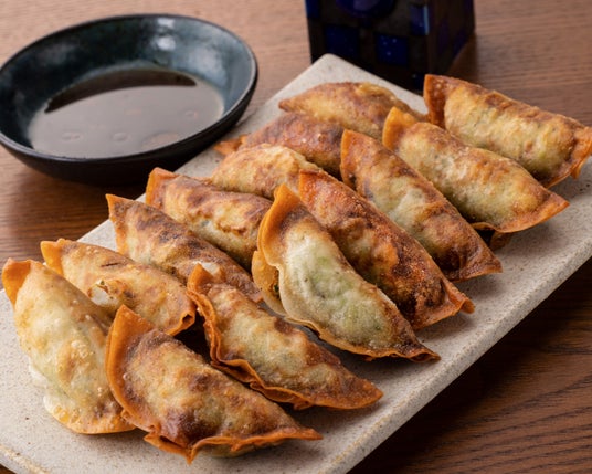 餃子は厚さ0.3mmの⽪を使った、極薄⽪餃子。おつまみ感覚でたくさん食べていただけるよう、⽪の厚さにこだわりました。具で使用している野菜は国産にこだわり、挽肉も国産豚を使用。表面はカリッと中はジューシーに、極薄⽪で小ぶりに作り女性でも食べやすい大きさに仕上げております。