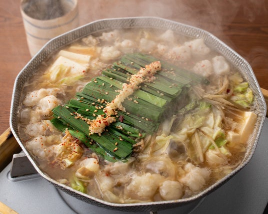 鶏ガラ・豚⾻をじっくりと炊き上げて作った特製スープ。鍋に使用しているキャベツ、ごぼう、ニラは国産にこだわり季節ごとに産地・農場を変え、野菜本来の旨味の強いものを厳選しております。モツは脂がのった国産牛の小腸のみを使用。