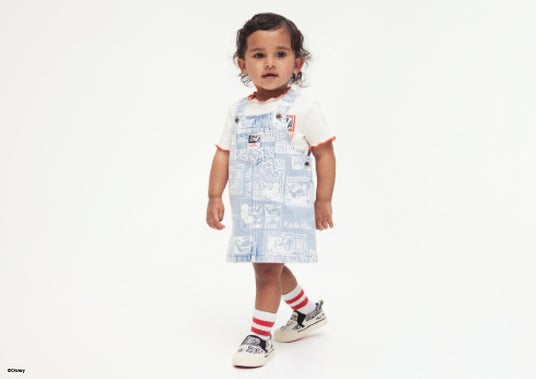 H&Mベイビー(70-105cm)「Disney's Mickey Mouse x Keith Haring」コレクション: パターンサロペットスカート¥2499 コットンリブトップス¥999 プリントスリッポンスニーカー(18-25) ¥1999