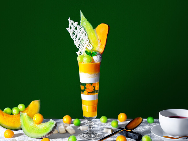 パフェの一番上には、フレッシュなメロンの果肉とメロンの風味を加えたバニラアイスクリーム、一層目は赤肉メロンムース、その下に食感のアクセントとしてスポンジケーキ、ほのかな塩味を感じるブリア・サヴァランチーズクリームの層が続きます。さらにその下には、季節を感じる爽やかな風味の梅酒で作られたゼリーの層、ブリア・サヴァランの層、そして最後の部分はメロンの風味を強調する緑のメロンゼリーで仕上げております。