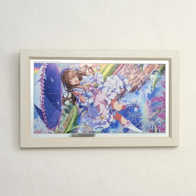 ずっしりとした木枠に収められた美しく輝くガラス製のミラー。ガラス製ミラーの特性に合わせた処理が可能にしたポートレート写真のような奥行きのある立体的な表現。雨上がりの青空の虹を背景に、雫と共に光り輝く彼女の魅力に溢れた一枚がここに完成しました。