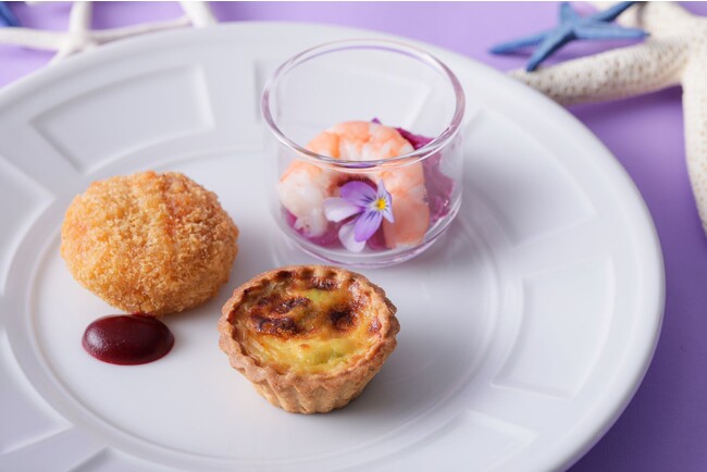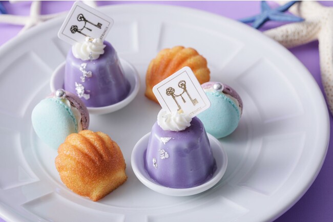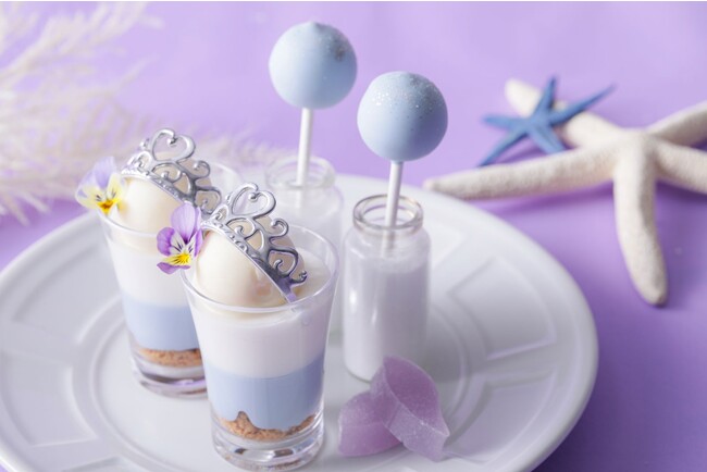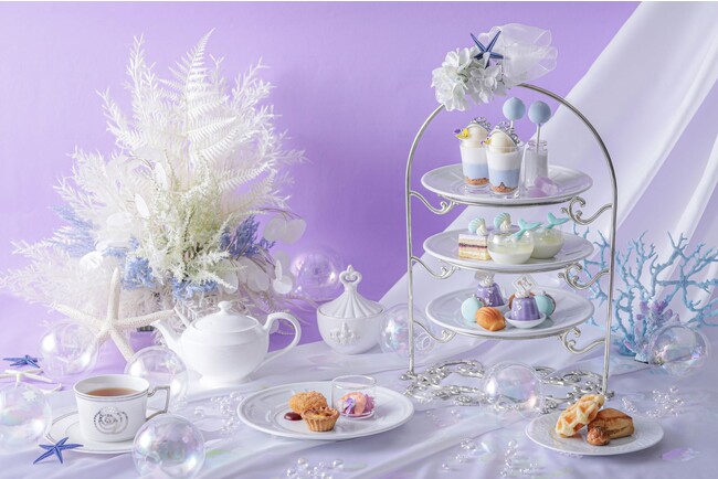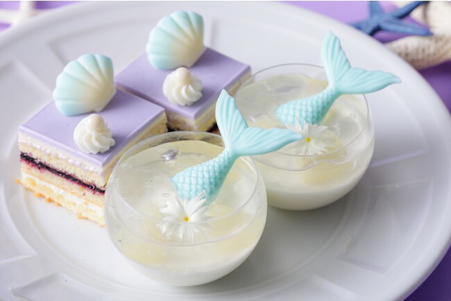 2023年より開始した各シーズンにバイカラー(2つの色)を使用した、“プリンセスバイカラーアフタヌーンティー”。6月~8月に関しては、アクアブルーとラベンダーパープルを使用し、マーメイドをテーマにしたスイーツをラインナップ。貝殻やマーメイドテール、ティアラなど、キュートな見た目のデザインに。