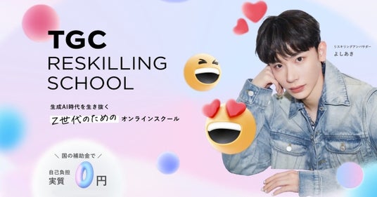 「TGCリスキリングスクール」は、デジタル社会・生成AI時代を生き抜く若者世代を育てるためのオンラインスクールです。2025年6月のサービススタート時には、Z世代のリスキリングにピッタリの7つの講座を提供します。Z世代の6割以上が経験したことのある「推し活」をテーマにした語学講座や、これからの社会で必須のスキルとなる「生成AI」を学ぶことのできる講座、ビジネスで活用できるプログラミングスキルを養成できる講座など、Z世代のリスキリングの意欲を高め、実社会で実践することのできる講座を展開します。Z世代のファッションアイコンとして活躍するモデルよしあき氏をリスキリングアンバサダーに迎え、若者世代のリスキリングを強力にバックアップします。