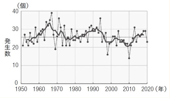 そして、台風は下のグラフからわかるように、そもそも増えていません。