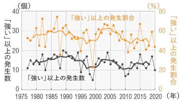 くわえて、台風は最大風速が毎秒33 メートルを超えると「強い」以上に分類されますが、下のグラフのとおり、「強い」以上の台風の発生数も発生割合も増えていません。