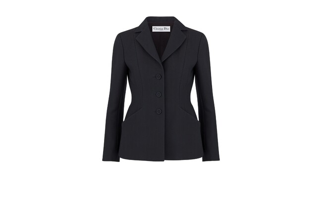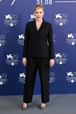 第79回ベネチア国際映画祭にて、映画『ホワイト ノイズ』のフォトコールに登場した女優のグレタ・ガーウィグ。マリア・グラツィア・キウリによるディオールのウイメンズ コレクションより、ブラックウールの「バー」ジャケットとパンツのセットアップを纏い登場しました。