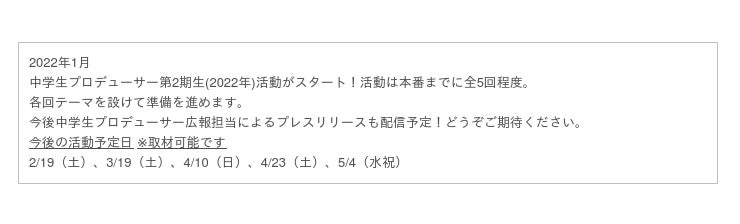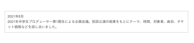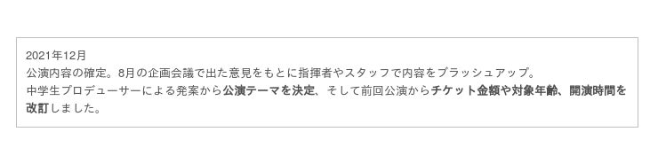 "中学生プロデューサー"は、「子ども達が社会を学ぶ場」の創出を目的に2021年より「こどもの日コンサート」の公演制作に携わる形で始動しました。今年も5/5「こどもの日コンサート2022」に向けての活動がスタート。昨年夏に行われた企画会議で決まった内容をもとに、主に広報、プログラム作成、台本構成の3チームに分かれて準備を進めます。演奏家やスタッフとの関わりを通して次世代の育成を試みるとともに、演奏家やスタッフが次世代と協同することの重要性を考える当ホール独自の企画です。