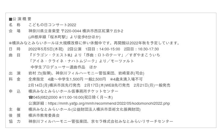 20年以上続く横浜みなとみらいホールの名物企画『こどもの日コンサート』を今年も開催します。今年のテーマは「モーツァルトは国境を越えて時代を越えて」。大作曲家・モーツァルトが生きた18世紀・ヨーロッパから私たちが生きる現在・日本まで、受け継がれる音楽、新しく生まれる音楽、色々な音楽に触れながら「音楽の力」を感じましょう!神奈川フィルハーモニー管弦楽団による大迫力の生演奏はもちろん、昨年から導入した「中学生プロデューサー」の活躍も見どころ。子どもから大人までみんなで楽しめるコンサートです。
