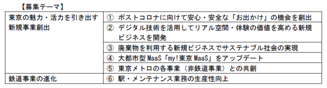東京メトロは「東京を走らせる力」をグループ理念として、東京に集う人々の生活や経済活動を支える存在として、鉄道事業を中心に、様々な事業に取り組んでいます。ポストコロナに向けて安心・安全な「お出かけ」の機会を創出するサービスや、目まぐるしい進化を遂げているデジタルサービスの活用アイデアなど、東京メトロの保有する経営資源と社外のアイデア・技術を組み合わせ、これからの東京を躍進させる「きっかけ」を募集します。
