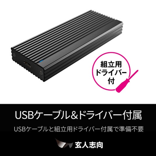 USBケーブル&組立用ドライバー付属で、SSDがあれば買ってすぐ使えます