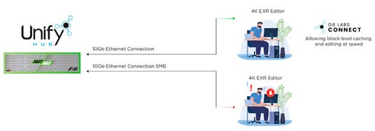 GB LabsのUnify Hubは、在宅勤務や複数のオフィスで働くメディア・制作業界のプロフェッショナルが、自分の作業ステーションから制作拠点に設置されたオンプレミスストレージに直接リモートアクセスできるようにするシステムです。