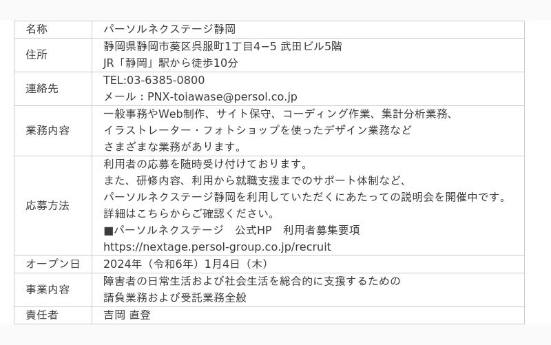 パーソルネクステージは、障害者の一般企業への就労に向けた実践的な業務経験とスキル向上などをサポートする就労継続支援A型事業所を運営しています。全国の企業からPC業務を中心とした「テレワーク」が可能な業務を受託しているため、体調や状況に応じてテレワークと通所を織り交ぜたはたらき方が提供できること、また、一般就労時に使えるPCスキル・業務経験を身に付けられることが大きな特徴です。23年12月現在、184名の障害のある方が利用しています。このたび、東海地方初進出であり10拠点目となる静岡オフィスを1月4日(木)にオープンいたします。また、オフィスのオープンに伴い、クルー(※1)の採用を開始いたします。