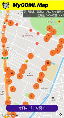 プロギング中はスタッフが「MyGOMI」を使用し、各コースのごみデータ(ごみの位置と量)を集計しました。可視化することで、ごみが集まりやすいポイントを把握できたと共に、参加者のモチベーションアップを図ることができました。
