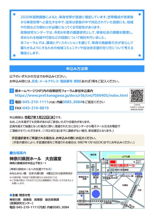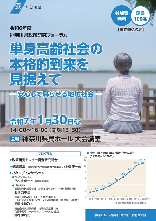 神奈川県政策研究センターでは、令和6年度の調査研究として、単身社会の課題を整理し、求められる地域や行政などの役割について検討を行いました。