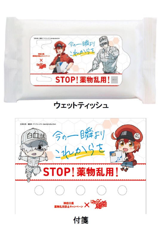 『はたらく細胞』のキャラクターに薬物乱用防止のメッセージを添えた啓発グッズを作成し、街頭キャンペーンや薬物乱用防止教室*において配布します。