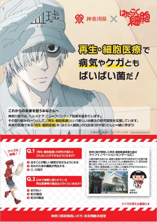 県では、「再生・細胞医療の産業化」や「薬物乱用防止」を推進していますが、こうした取組をより一層わかりやすく伝えるために、『はたらく細胞』とコラボした普及啓発を実施します。