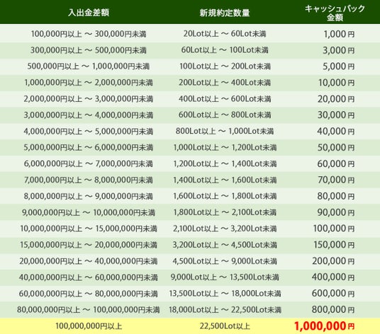 お客様の入出金差額および「みんなのFX」「LIGHT FX」の新規約定数量に応じて、下表の通り入出金差額の最大1%をキャッシュバックいたします。