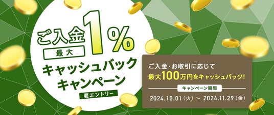 トレイダーズホールディングス株式会社(東京証券取引所スタンダード市場8704)のグループ会社で、外国為替証拠金取引事業(FX取引)等を営むトレイダーズ証券株式会社(本社:東京都渋谷区、代表取締役:須山 剛、以下「トレイダーズ証券」)は、2024年10月1日(火)より外国為替取引サービス「みんなのFX」及び「LIGHT FX」において、「ご入金で最大1%キャッシュバックキャンペーン」を実施することを決定しました。