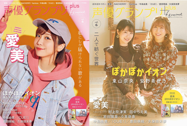 創刊27周年を迎えたナンバーワン声優マガジン『声優グランプリ』の別冊シリーズ『声優グランプリplus femme(プラス ファム)』の第6弾が1月31日(月)に発売。愛美が表紙、ぽかぽかイオン(東山奈央&安野希世乃)がアナザーカバーを飾る。このたび、表紙とアナザーカバー、法人別購入特典の絵柄が解禁された。
