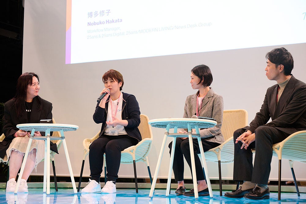 続いて後半のパネルディスカッションでは、株式会社ハースト・デジタル・ジャパンの博多 修子がモデレーターとなり、「ハーストラボ」アジア地域での第一号投資先となった株式会社zooba CEO 名和 彩音氏、そして「ハーストラボ」の支援先である株式会社MamaWell CEO 関 まりか氏と株式会社Yuimedi CFO 村岡 和彦氏がパネリストとして登場しました。