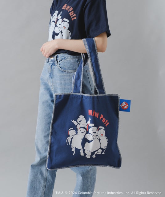 ぐるっと入ったステッチが目を引くデザイン。ゴーストバスターズシリーズの名シーンをモダンアート風に描いたアートは、個性的かつおしゃれ。ミニマシュマロマンたちが描かれたネイビーのトートバッグは、よりカジュアルに使えます。大きめのロゴマークタグもポイントです。