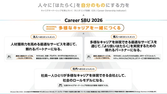 パーソルキャリアは「Career SBU 2026」のラストイヤーとなる2025年度も全社一丸となり、企業には採用力を高める、個人には「はたらく」の可能性を広げるサービス開発と提供を通じて、顧客体験の向上に取り組みます。そして、 SEASONAL MISSION「多様なキャリアを一緒につくる」を成し遂げるべく、パーソルグループに留まらずさまざまなパートナーとともに「はたらく」について考え、多様なキャリアを創出していきます。