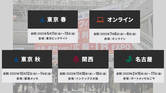 本年から東京展が5月・10月の年2回開催となり、オンライン展示会を含めた3都市(東京・大阪・名古屋)・年5回開催。各会場その地域に根付く企業の管理部門が来場するため、ご出展いただくことで全国への販路拡大に貢献します。
