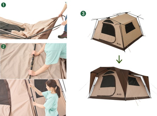 テント本体とフレームが一体型で、初心者や女性の方でも手軽に約90秒で設営・撤収が可能なテント。設営は簡単3ステップ。