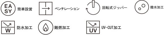 シート素材には米国の難燃基準「CPAI-84」に適合した燃えにくい生地を使用。また、UV-CUT加工により紫外線を90%以上カットし、防水・撥水機能を備えている。撥水機能は3級以上で、汚れが付きにくく雨をはじき、優れた耐水圧とシームテープ加工により高い防水性を実現。